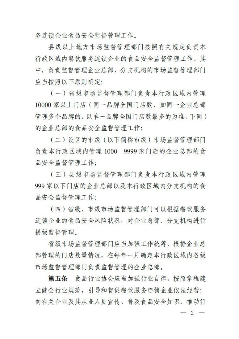 在監(jiān)管機制方面,《規(guī)定》明確,門店數(shù)量在*****家以上、****—****家、***家以下的餐飲服務連鎖企業(yè)總部的食品安全監(jiān)管工作分別由省級、市級、縣級市場監(jiān)管部門負責;明確省級市場監(jiān)管部門的工作統(tǒng)籌職責,要求其根據(jù)餐飲服務連鎖企業(yè)總部管理的門店數(shù)量變化情況,在每年*月確定本行政區(qū)域內(nèi)各級市場監(jiān)管部門負責監(jiān)督管理的企業(yè)總部。