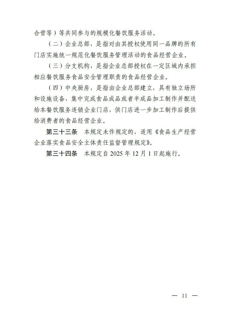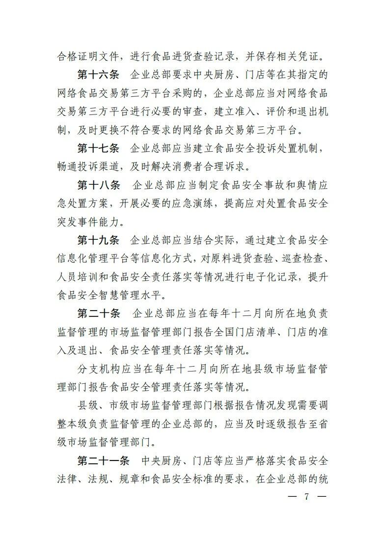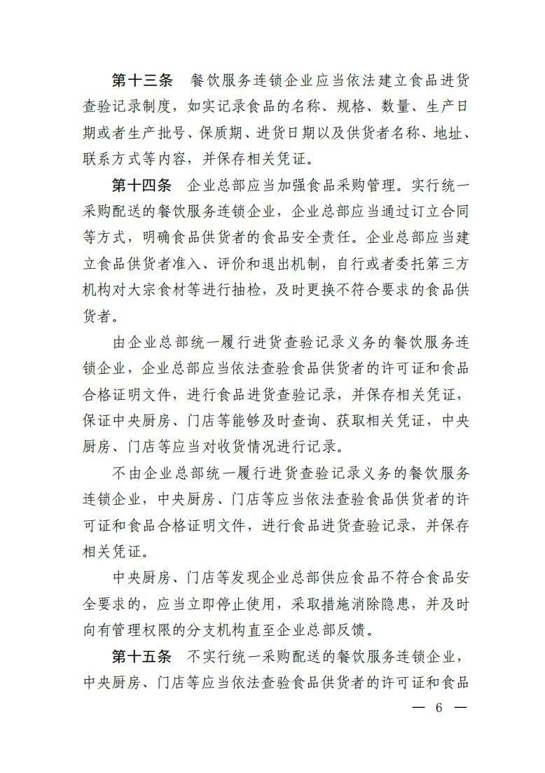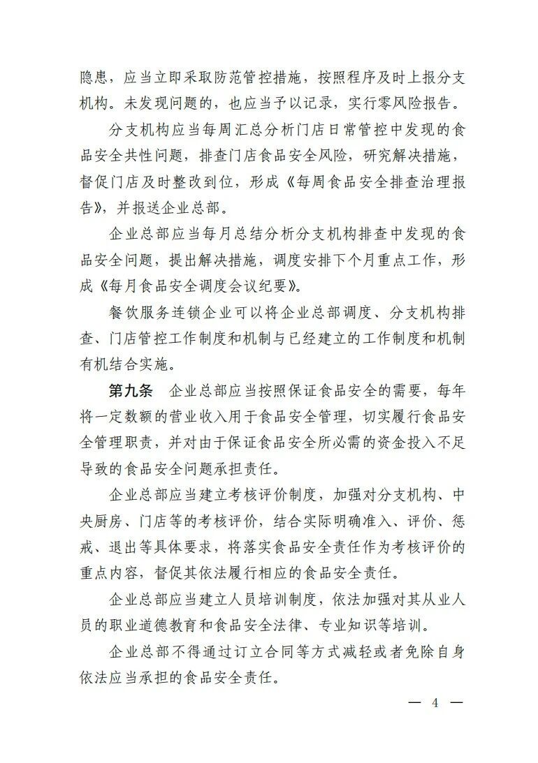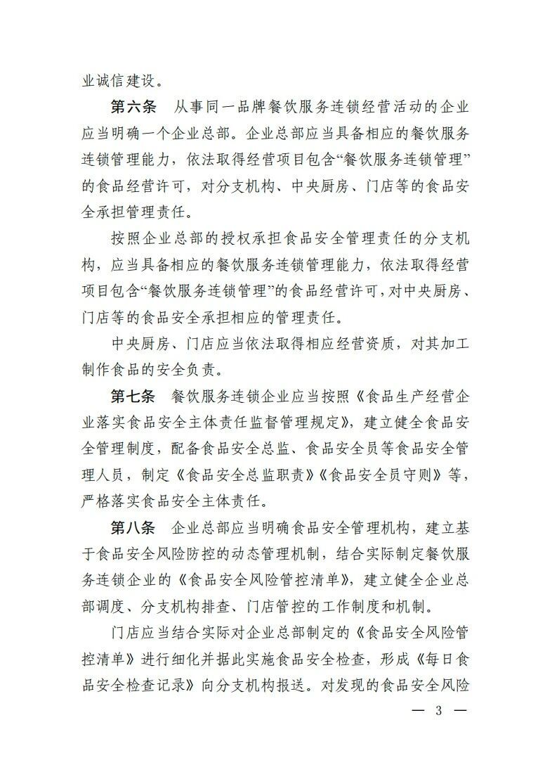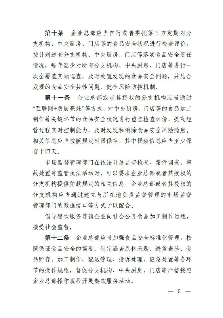 在責任分擔機制方面,《規(guī)定》要求,餐飲服務連鎖企業(yè)實行貫通式管理,建立總部每月調(diào)度、分支機構(gòu)每周排查、門店每日管控的工作制度和機制。同時,強調(diào)抓住“關鍵少數(shù)”,夯實企業(yè)總部管理責任,對企業(yè)總部“管什么”“怎么管”予以明確,細化企業(yè)總部在考核評價、人員培訓、“互聯(lián)網(wǎng)+明廚亮灶”、標準化管理、食品采購、食品安全投訴處置等方面的責任義務。