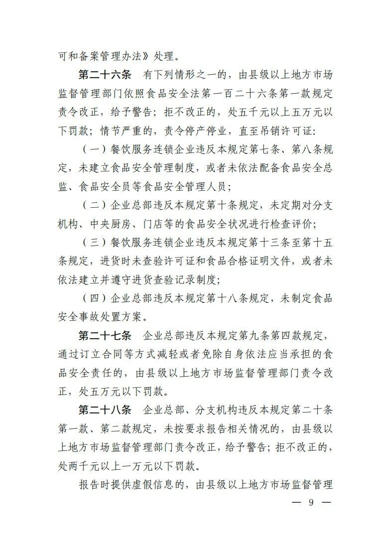 在法律責任方面,《規(guī)定》細化了餐飲服務連鎖企業(yè)未按要求建立食品安全管理制度、未配備食品安全管理人員、進貨時未查驗許可證和食品合格證明文件、未向市場監(jiān)管部門報告有關情況,以及企業(yè)總部轉(zhuǎn)嫁自身應當承擔的食品安全責任等違法情形的相應罰則,增強制度的剛性約束。